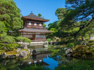 1489年(長享3)に上棟した銀閣(国宝)は宝形造2層の殿開。上層は潮音閣。下層は心空殿。庭の北にある東求堂(国宝)内部に茶室同仁斎があり、四畳半茶室の原型といわれる。