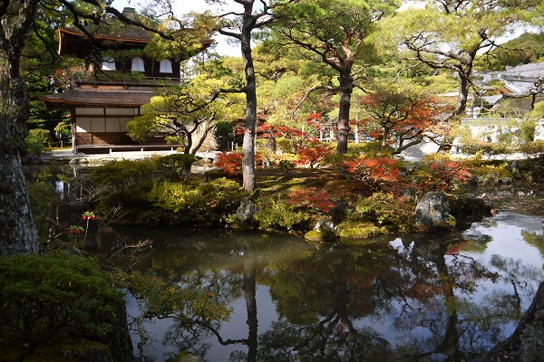 中門の先に円錐形に砂を盛りあげた「向月台」、その左に一段高く砂をならして太い筋文様を入れた「銀沙灘(ぎんしゃだん)」が造られて、錦鏡池を前にして「銀閣」(観音殿)が建つ。銀閣寺の独特の静謐な庭園構成が広がっている。